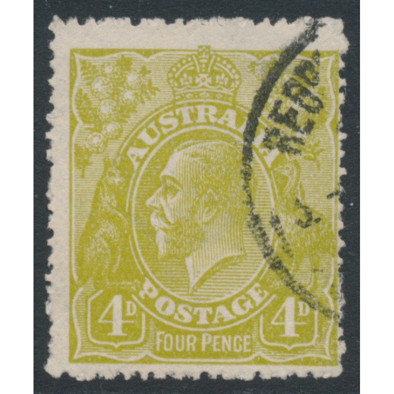 AUSTRALIA 1924 4d greenish olive KGV Head, single watermark, on coarse mesh paper, used – no thins, tears or bends. Has a Starling certificate. BW(ACSC) Cat. # 114Baa