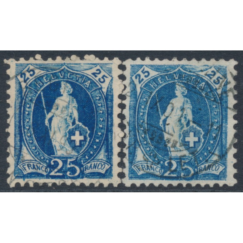 SWITZERLAND - 1899 25c blue Helvetia, 'white flaws NE' x 2 examples, used – Zum. # 73D.2.42