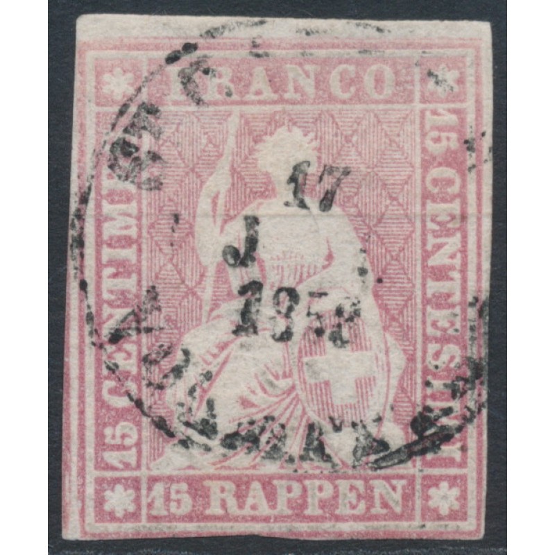 1858 15Rp rose Sitting Helvetia, imperforate (green thread, late Bern printing), used – no thins, tears or bends. Has a been expertised as genuine by Marchand.