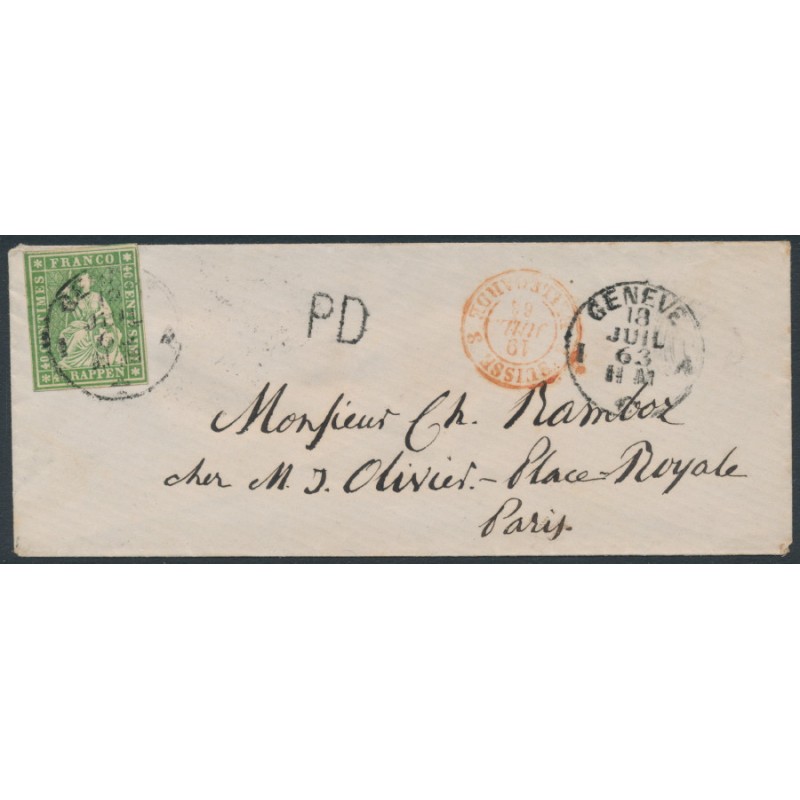 1863 40Rp yellowish green Sitting Helvetia, imperforate (green thread, late Bern printing), used – on a cover from Genève (Geneva) 18 VII 1863 to Mr. Charles Ramboz, Place Royale 1, Paris, the stamp and the envelope are sound. The cancellation date is less than two weeks before this issue was invalidated.