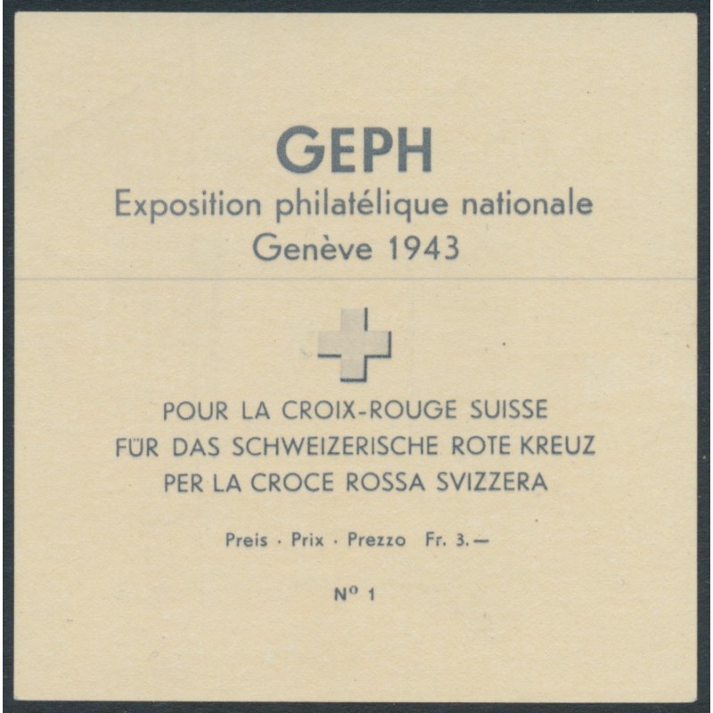 1943 GEPH Stamp Exhibition, Genève M/S, mint never hinged – no thins, tears or bends.