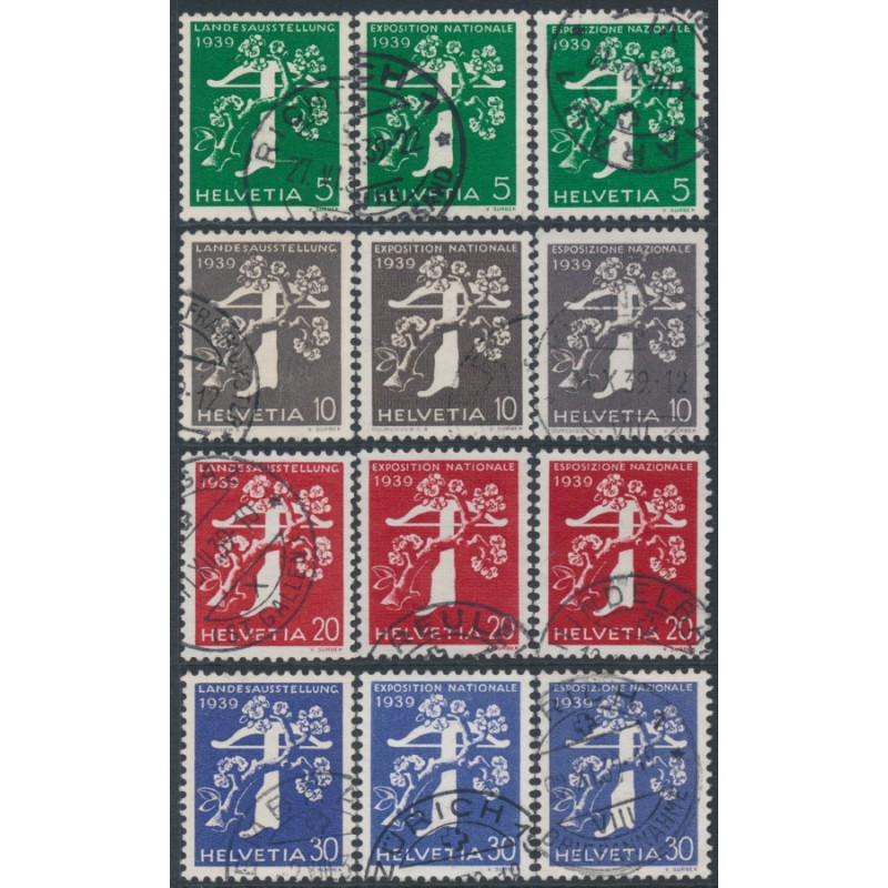 1939 5c to 30c Swiss National Exhibition sets of 4 in each of the three different languages (German, French & Italian), used – no thins, tears or bends.