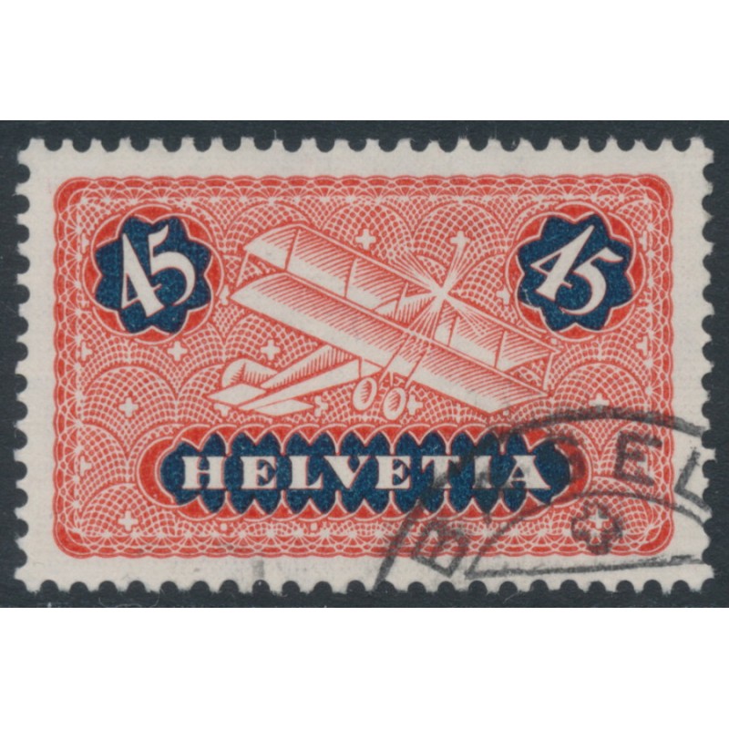 SWITZERLAND / SCHWEIZ / SUISSE / SVIZZERA 1937 45c red/ultramarine Airmail on ribbed paper, used – no thins, tears or bends. Michel Cat. # 183z Zumstein Cat. # F8x