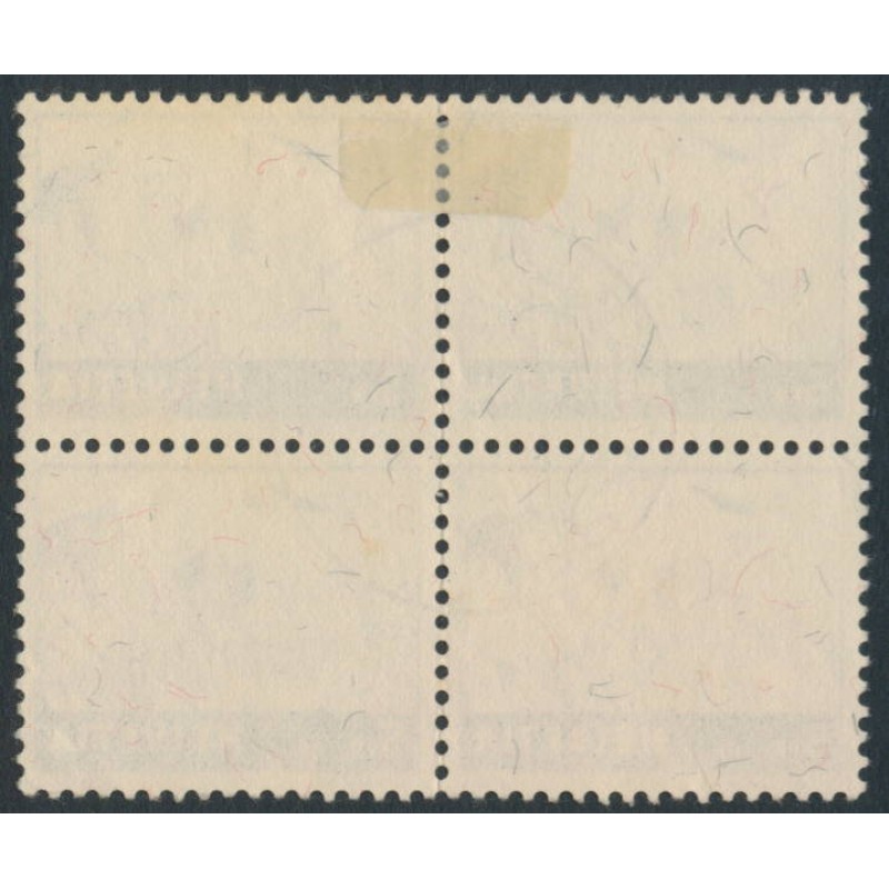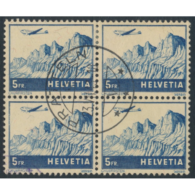 SWITZERLAND / SCHWEIZ / SUISSE / SVIZZERA 1941 5Fr dark blue on buff Airmail, block of 4, used – no thins, tears or bends. Michel Cat. # 394 Zumstein Cat. # F34