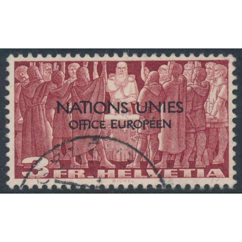 1950 3Fr red-brown Definitive o/p NATIONS UNIES / OFFICE EUROPÉEN, used – no thins, tears or bends.