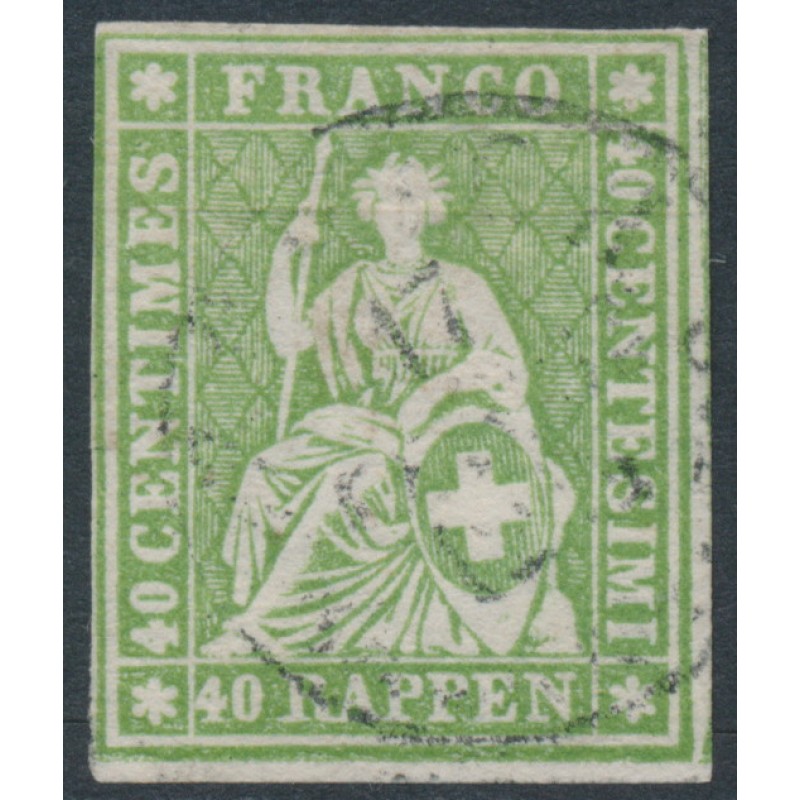SWITZERLAND - 1860 40Rp yellowish green Helvetia (green thread, late Bern), used – Zumstein # 26Ga