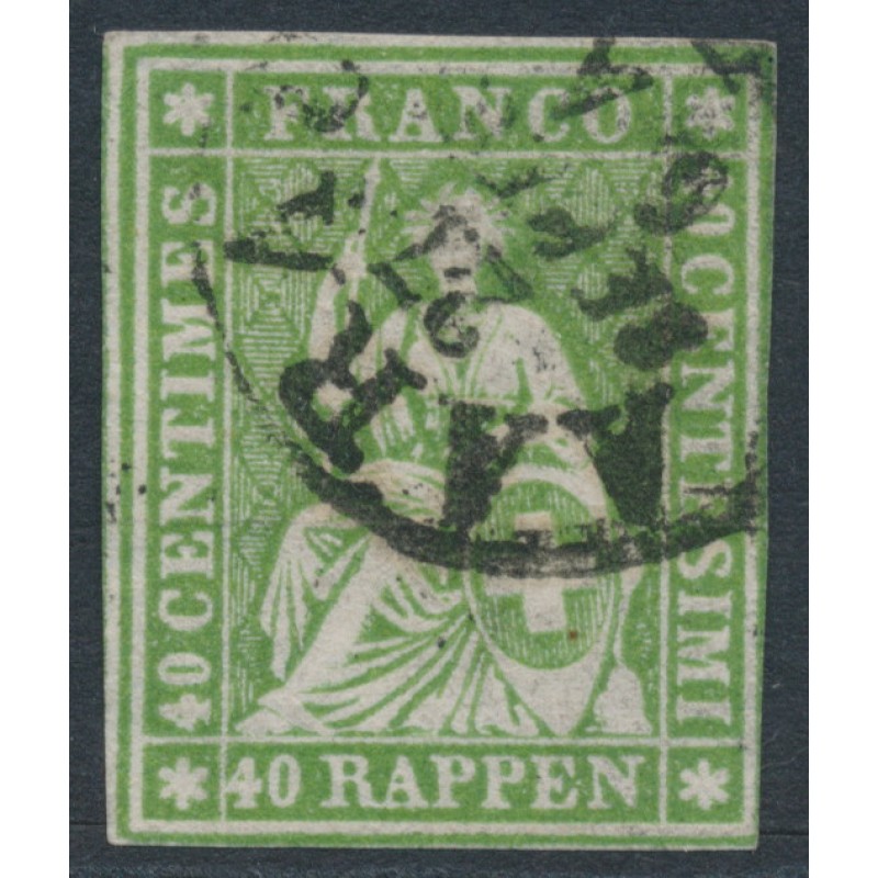 1860 40Rp yellowish green Sitting Helvetia, imperforate (green thread, late Bern printing), used – no thins, tears or bends.