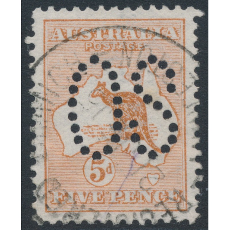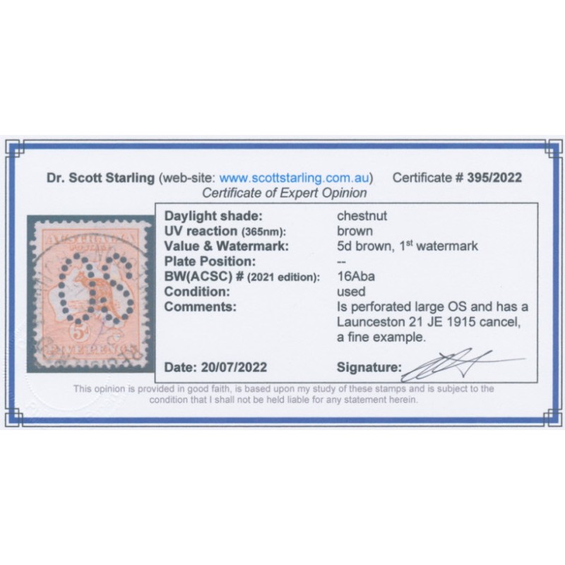 AUSTRALIA 1913 5d chestnut Kangaroo, 1st watermark, perforated large OS, used – no thins, tears or bends. Has a Staling certificate. BW(ACSC) Cat. # 16Aba SG Cat. # O7
