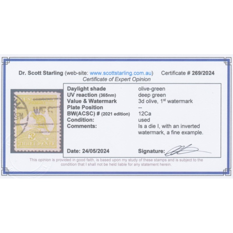 1913 3d olive-green Kangaroo, die I, 1st watermark, inverted watermark, used – no thins, tears or bends. Has a Starling certificate.