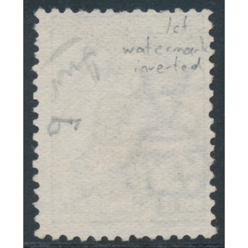1913 1/- green Kangaroo, 1st watermark, with an inverted watermark, used – has a heavy parcel cancel, otherwise sound. Has a Starling certificate.