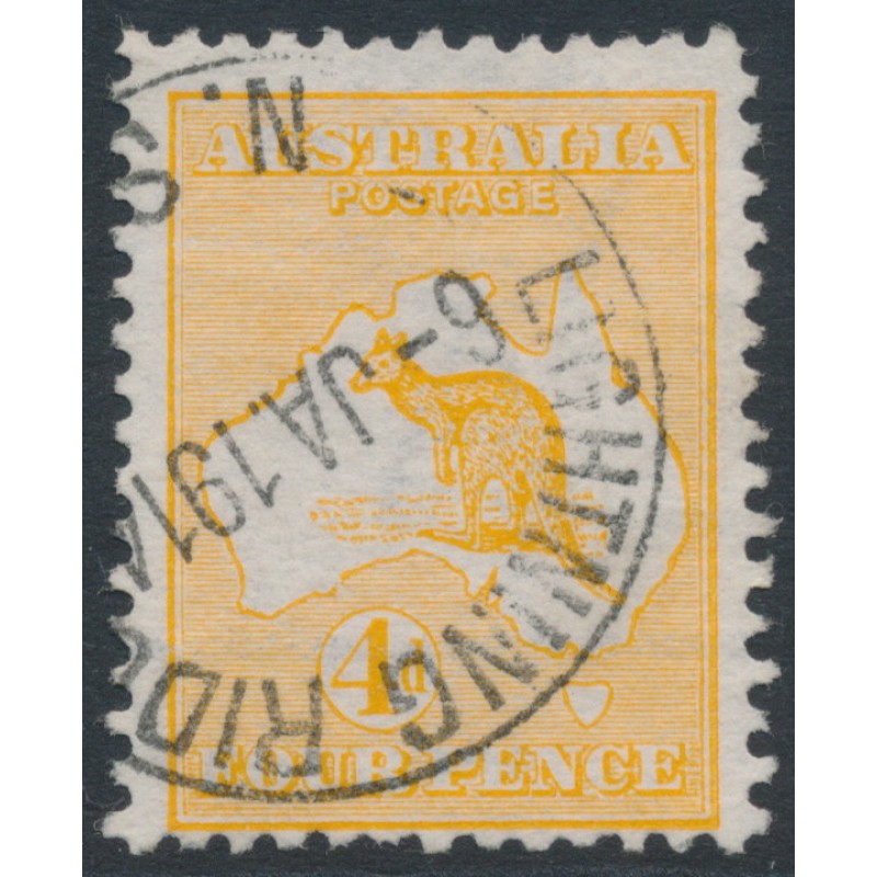 AUSTRALIA 1913 4d orange Kangaroo, 1st watermark, used – has a Lightning Ridge 6 JA 1914 cancel, no thins, tears or bends. BW(ACSC) Cat. # 15A SG Cat. # 6