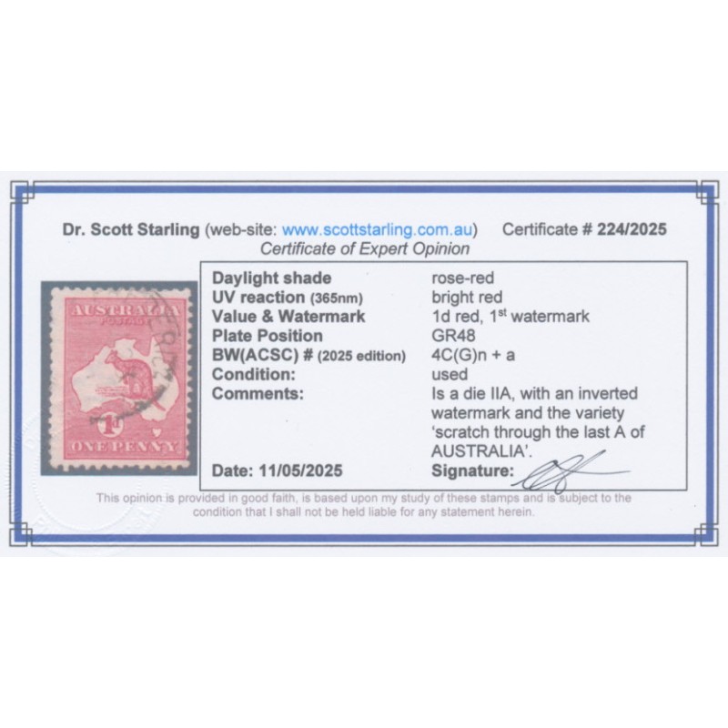 1914 1d pale red Kangaroo, die IIA, inverted 1st watermark, plus the variety ‘scratch through last A of AUSTRALIA’ [position = GR48], used – no thins, tears or bends. Has a Starling certificate.