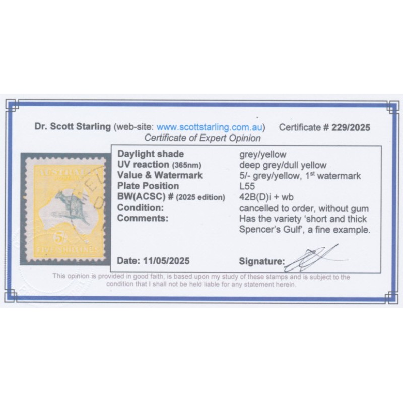 1913 5/- grey/yellow Kangaroo, 1st watermark, with the variety ‘short and thick Spencer’s Gulf’ [position = L55], cancelled to order – without gum, no thins, tears or bends. Has a Starling certificate.