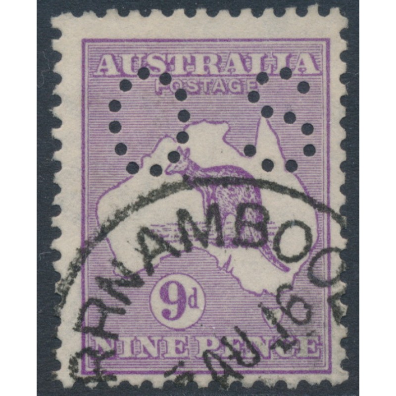 AUSTRALIA 1915 9d violet Kangaroo, 2nd watermark, perforated OS, used – no thins, tears or bends. Has a Starling certificate. BW(ACSC) Cat. # 25Aba SG Cat. # O34