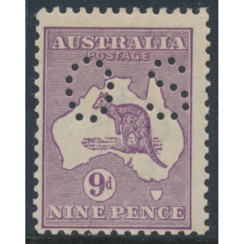 1916 9d violet Kangaroo, die II, 3rd watermark, perforated OS, mint hinged – no thins, tears or bends. Has a Starling certificate.
