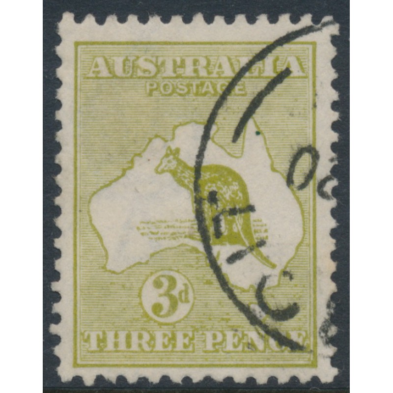 1915 3d olive-green Kangaroo, die II, 3rd watermark, used – no thins, tears or bends. Has a Starling certificate.