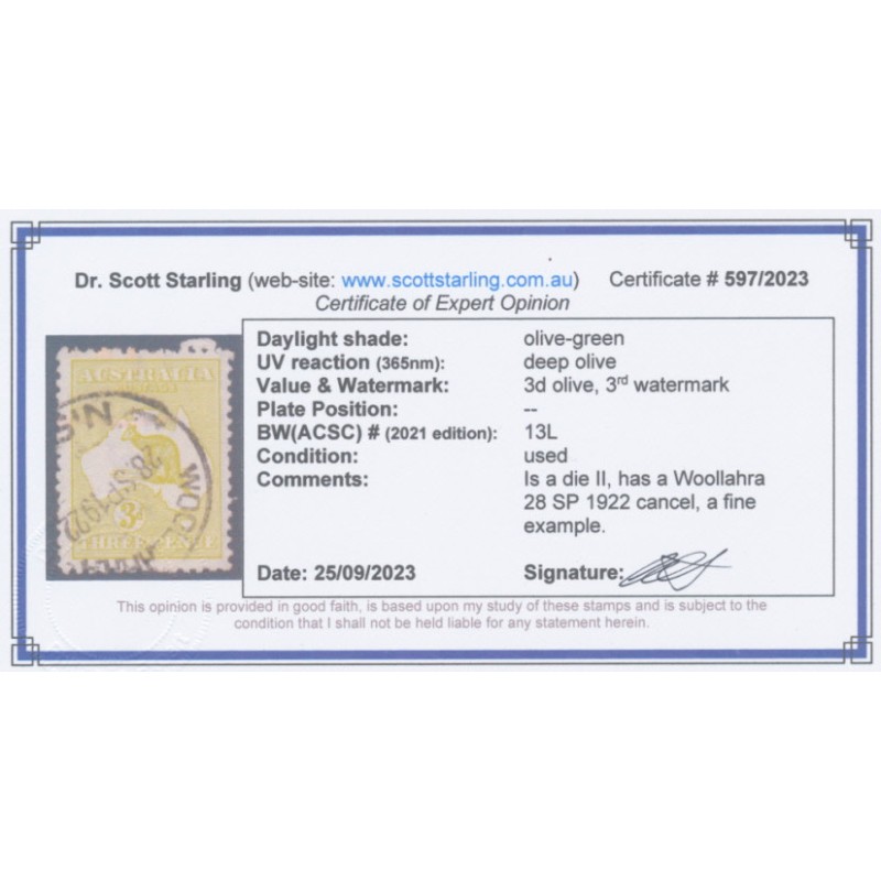 AUSTRALIA 1915 3d olive-green Kangaroo, die II, 3rd watermark, used – no thins, tears or bends. Has a Starling certificate. BW(ACSC) Cat. # 13L SG Cat. # 37da