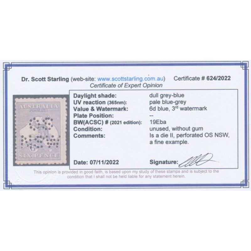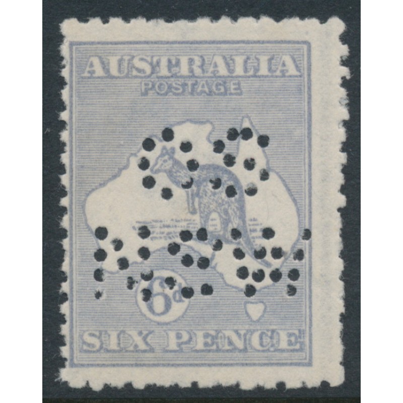 1915 6d dull grey-blue Kangaroo, die II, 3rd watermark, perforated OS NSW, unused – without gum, no thins, tears or bends. Has a Starling certificate.
