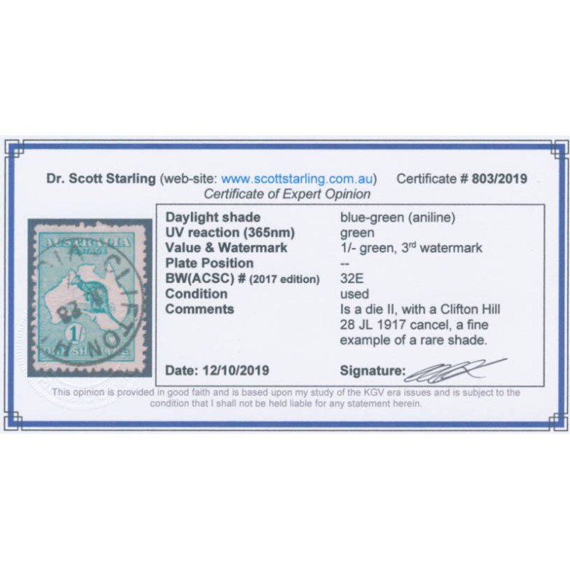 1916 1/- deep blue-green [aniline] Kangaroo, die II, 3rd watermark, used – no thins, tears or bends. Has a Starling certificate.