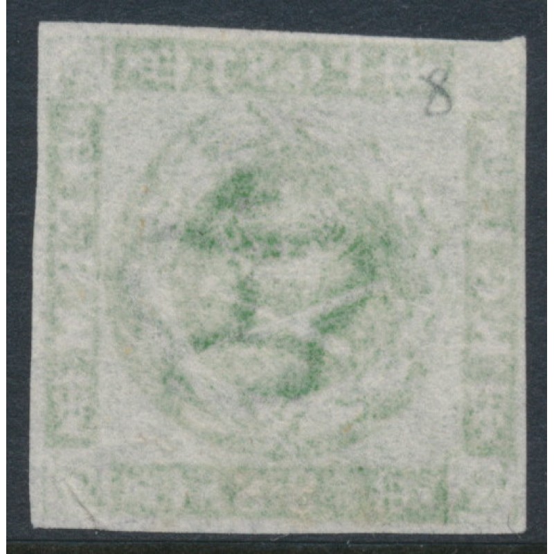DENMARK - 1858 8Sk green Crown, imperforate, lined background, used – Facit # 8
