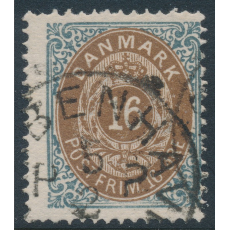 DENMARK - 1875 16øre brown/grey Numeral, perf. 14:13½, inverted watermark, used – Facit # 33evm