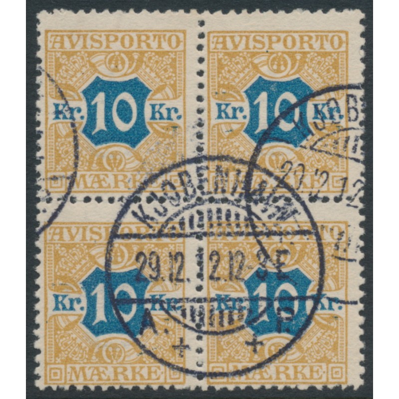 DENMARK / DANMARK 1907 10Kr brown/blue Newspaper Stamp (Avisporto) in a block of 4, used – no thins, tears or bends. Facit Cat. # TI10 Michel Cat. # V10X