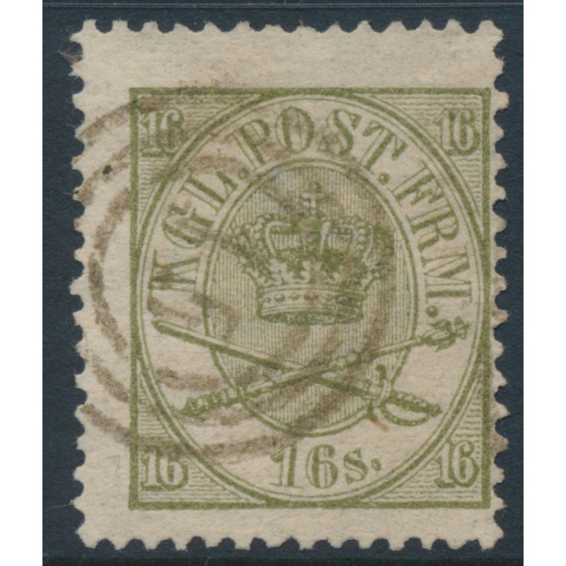 DENMARK / DANMARK 1864 16Sk greenish olive Crown, perf. 13:12½, used – no thins, tears or bends. Facit Cat. # 15c Michel Cat. # 15A