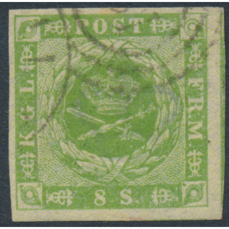 DENMARK - 1857 8Sk yellow-green Crown, dotted background, imperforate, used – Facit # 5a