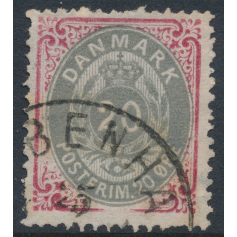 DENMARK - 1875 20øre grey/carmine Numeral, perf. 14:13½, inverted frame, used – Facit # 34e