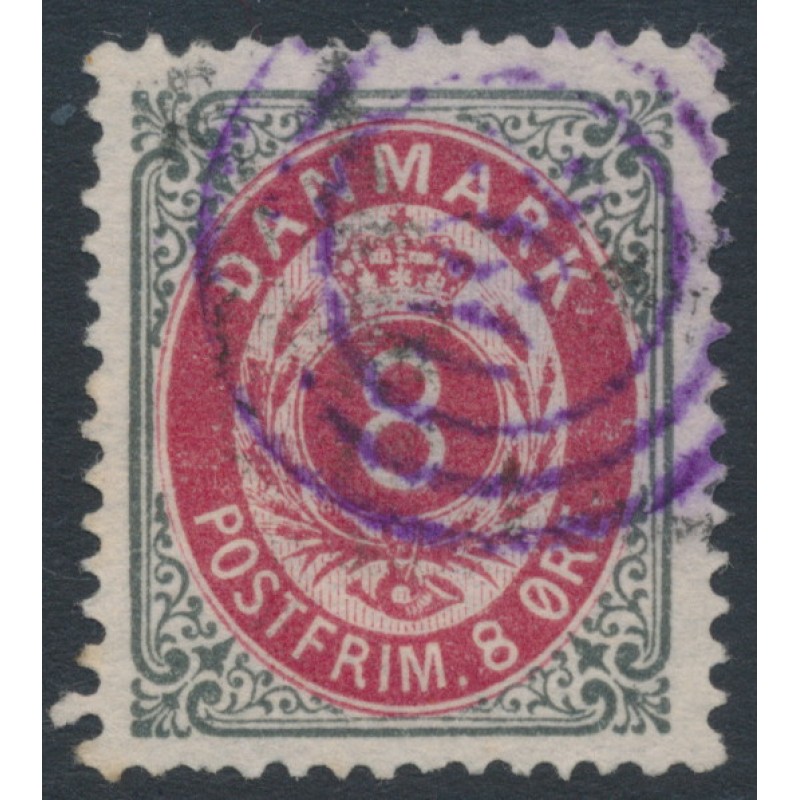 DENMARK - 1875 8øre red/grey Numeral, perf. 14:13½, violet cancel – Facit # 31c