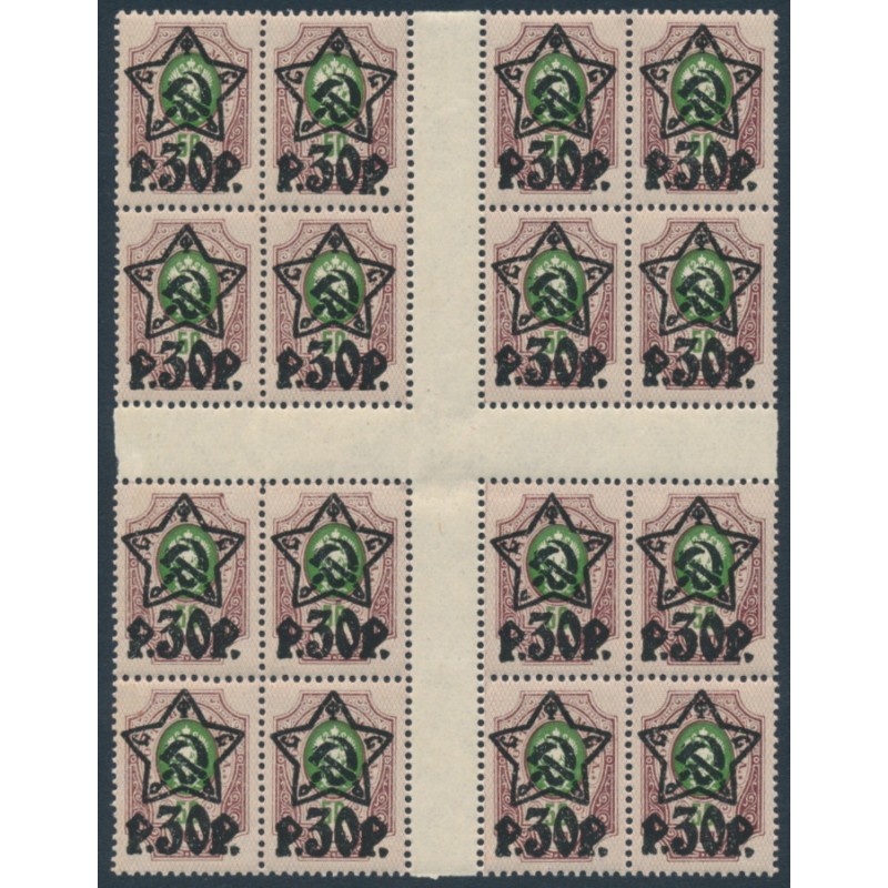 1922 30R on 50Kop brown-purple/green Coat of Arms, lithographic overprint, four panes of four with the central cross gutter (Herzstuck), mint never hinged – no thins, tears or bends.