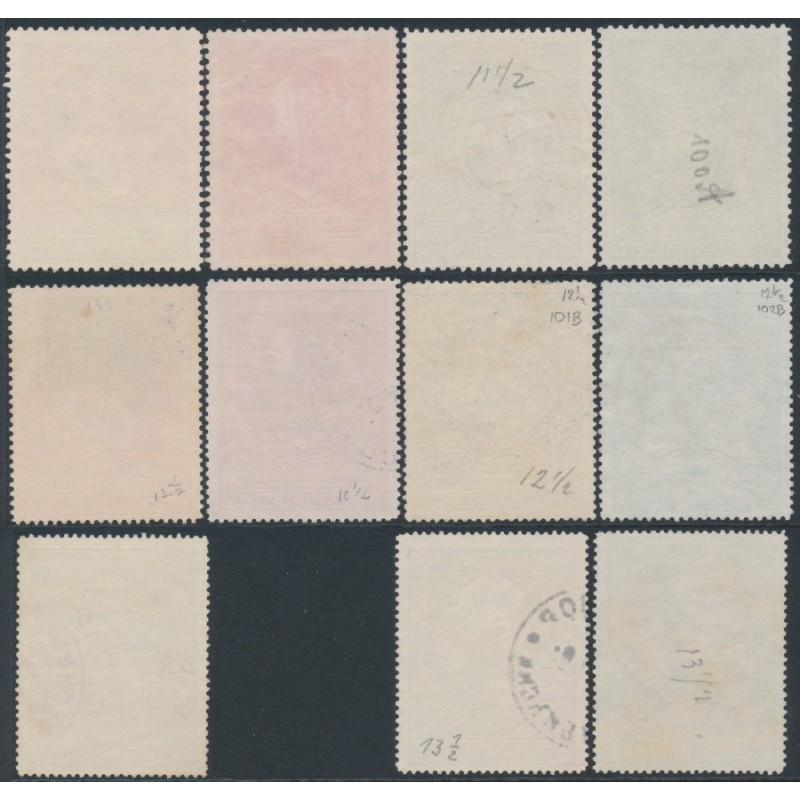 1914 1Kop to 10Kop War Relief sets on coloured paper in each of the three perforations: 11½:11½, 12½:12½ & 13½:13½, missing only the rare 3Kop value perf. 13½, used – no thins, tears or bends.