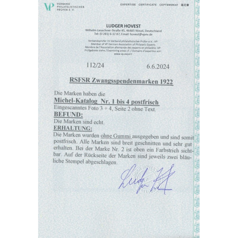 1922 2000R to 6000R Hunger Relief (Rostov-on-Don) imperforate set of 4, unused – without gum (as issued), no thins, tears or bends. Has a Hovest photo-certificate.