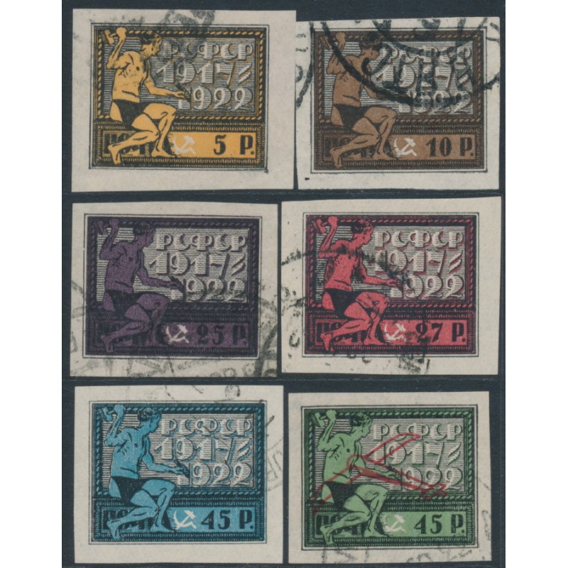 1922 Fifth Anniversary of the October Revolution set of 6, used – no thins, tears or bends. The 45R airmail value has been expertised as genuine by Hovest.