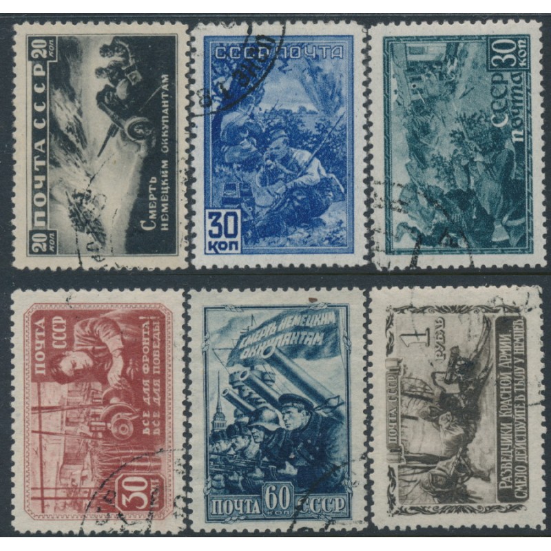 RUSSIA / U.S.S.R. / SOVIET UNION / РОССИЯ 1942 20K to 1R Great Fatherland War set of 6, used – no thins, tears or bends. Michel Cat. # 836-841 SG Cat. # 994-999