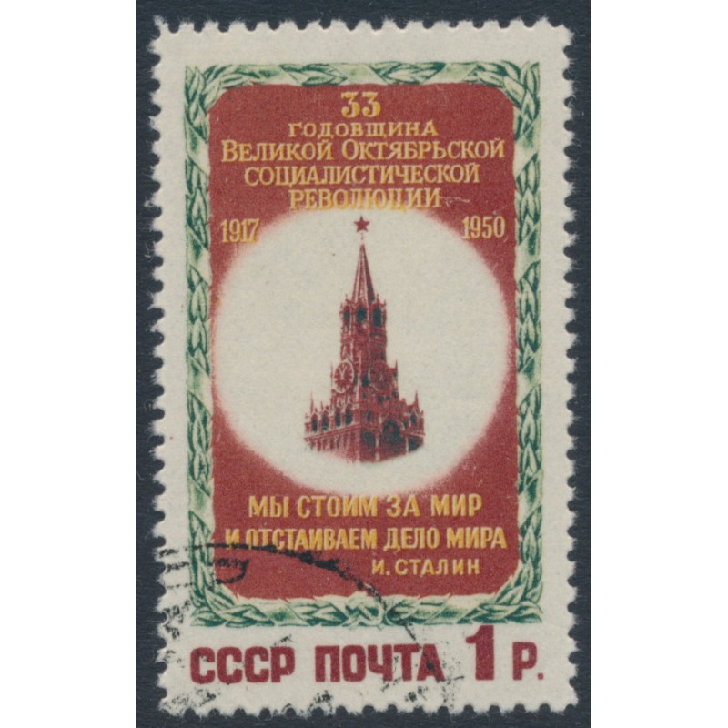 RUSSIA / U.S.S.R. / SOVIET UNION / РОССИЯ 1950 1R red/green Anniversary of the October Revolution, used – no thins, tears or bends. Michel Cat. # 1521 SG Cat. # 1665