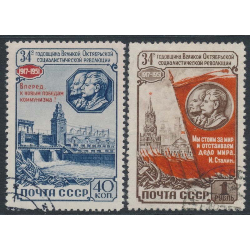 RUSSIA / U.S.S.R. / SOVIET UNION / РОССИЯ 1951 40K & 1R October Revolution set of 2, used – no thins, tears or bends. Michel Cat. # 1599-1600 SG Cat. # 1731-1732