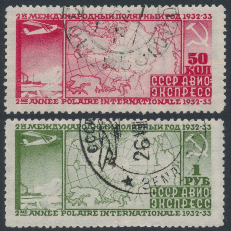 1932 50K red & 1R green Polar Flight set of 2, perf. 12½, used – no thins, tears or bends.