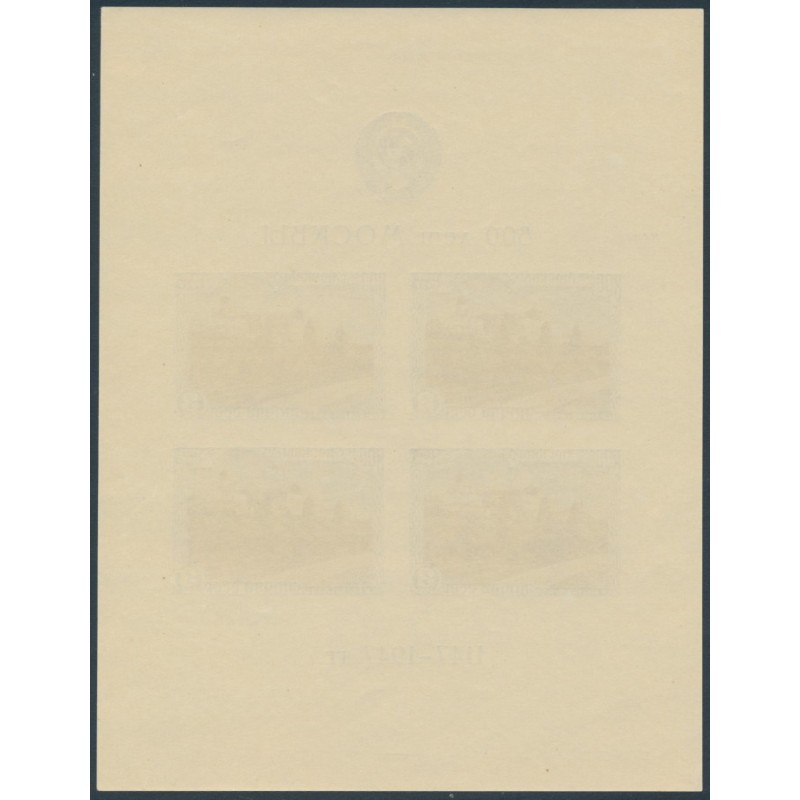 1947 Anniversary of the City of Moscow M/S, 1956 re-issue (the 800 ЛЕТ МОСКВЫ inscription at the top is 60mm long and the distance between this and the 1147-1947 inscription at the base is 91mm), mint never hinged – no thins, tears or bends.