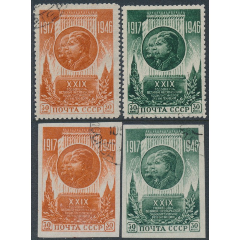 1946 30K red-brown & 30K green October Revolution sets of 2, perf. & imperf., used – no thins, tears or bends.