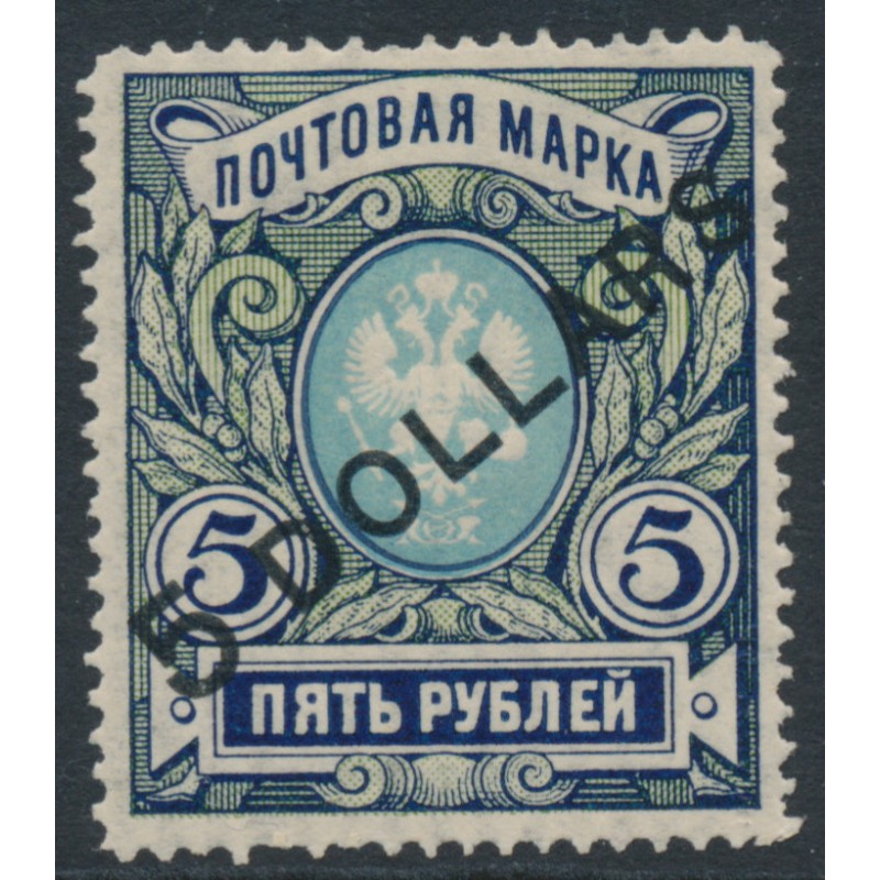 RUSSIA / РОССИЯ / CHINA / КИТАЙ 1917 $5 on 5R green/olive/blue Coat of Arms, mint hinged – no thins, tears or bends. Has been expertised as genuine by Hovest. Michel Cat. # 51 SG Cat. # 56