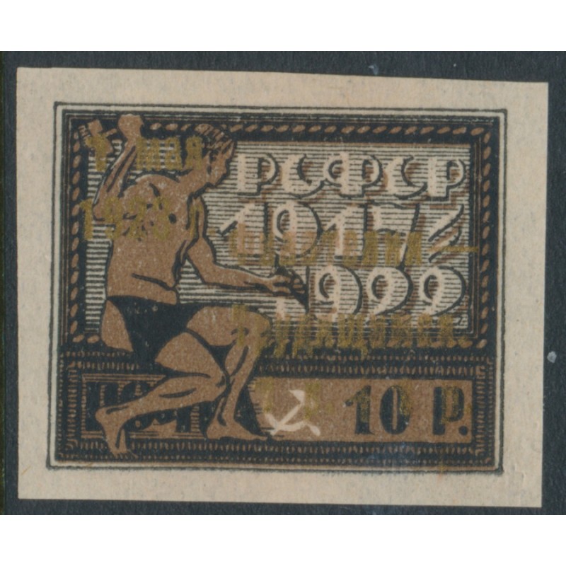 1923 1R+1R on 10R black/brown October Revolution overprinted for Stamp Day in gold, mint hinged – no thins, tears or bends. Has been expertised as genuine by Hovest.