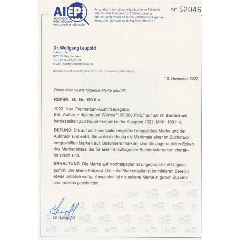 1922 10000R on 250R violet Lyre, typographic print, mint hinged – no thins, tears or bends. Has a Leupold photo-certificate.
