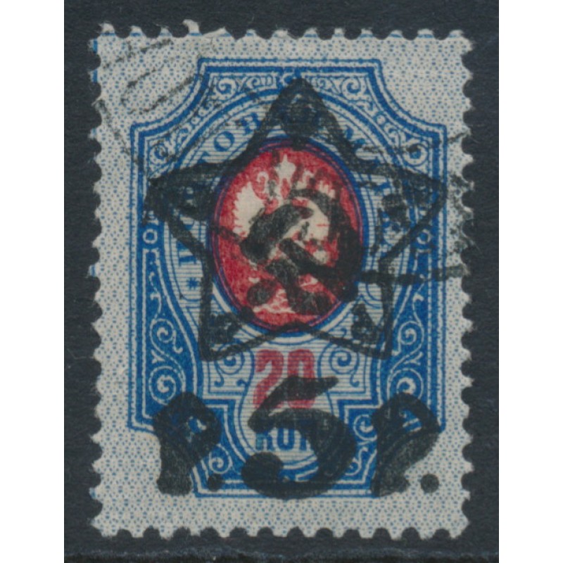 1922 5R on 20Kop blue/red Coat of Arms, perf. 14½:14¾, typographic overprint, used – no thins, tears or bends. Has been expertised as genuine by Hovest.