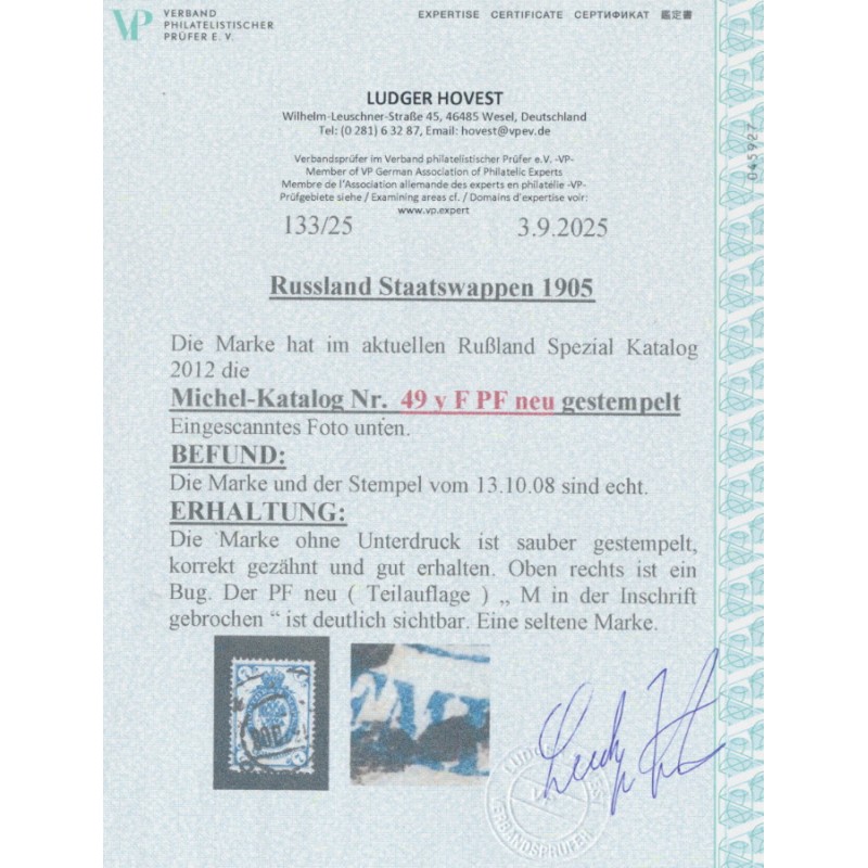 1905 7Kop blue Coat of Arms, vertically laid paper, with the varieties ‘missing background printing’ and ‘broken М of the word СЕМЬ’, used – no thins, tears or bends. Has a Hovest photo-certificate.