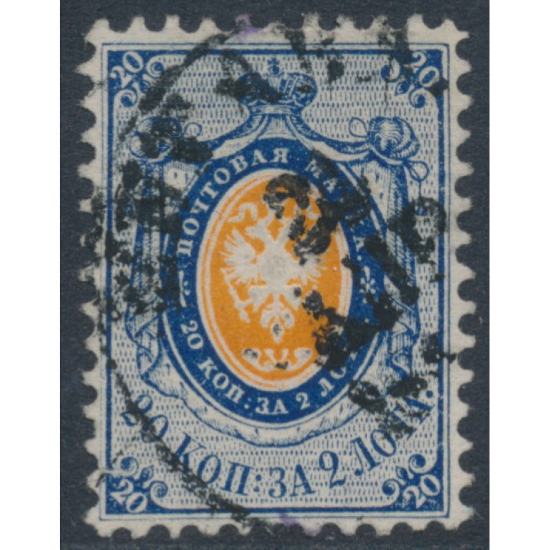 RUSSIA / РОССИЯ 1858 20Kop blue/orange Coat of Arms, perf. 12¼:12½, no watermark, used – has a small tear, otherwise sound. Michel Cat. # 6 SG Cat. # 6