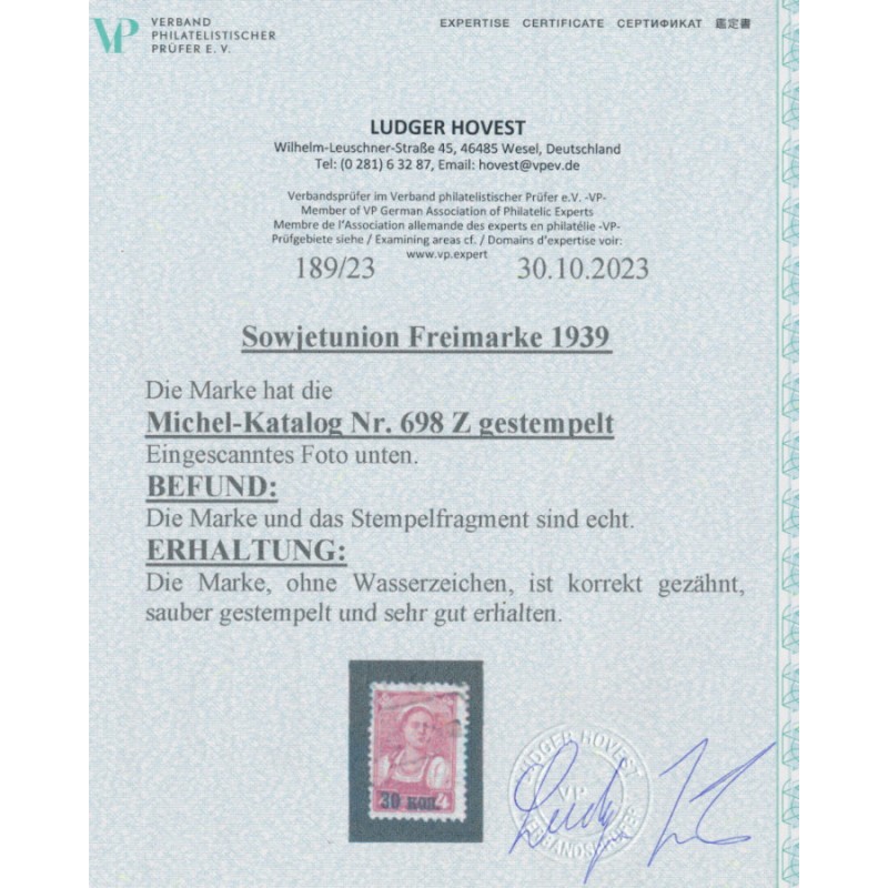 1939 30Kop on 4Kop purple Female Worker, no watermark, used – no thins, tears or bends. Has a Hovest photo-certificate.