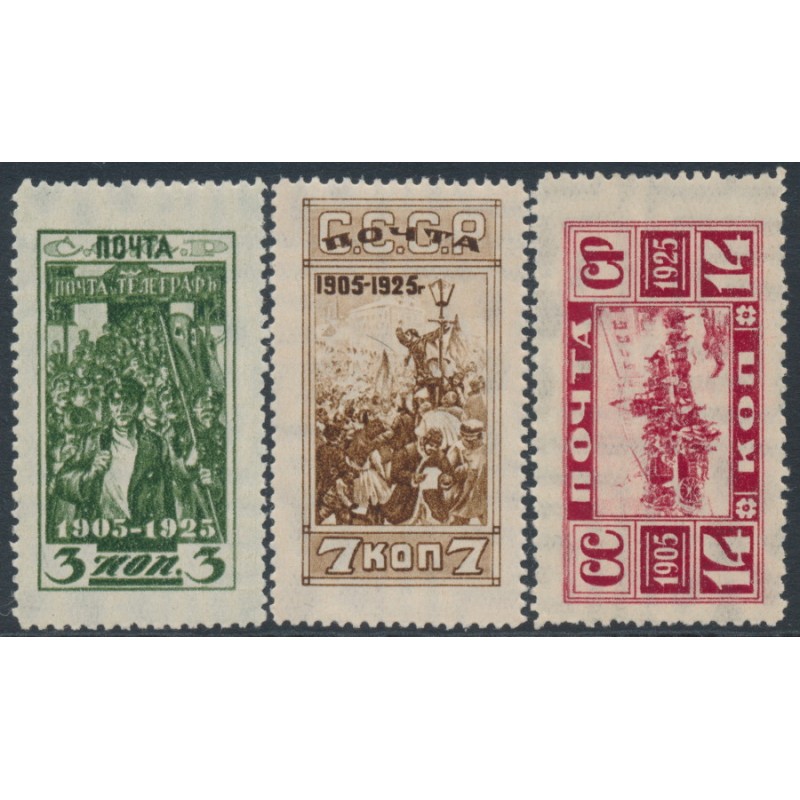 1925 3K to 14K Centenary of the 1905 Revolution set of 3, perforated, mint hinged – no thins, tears or bends.