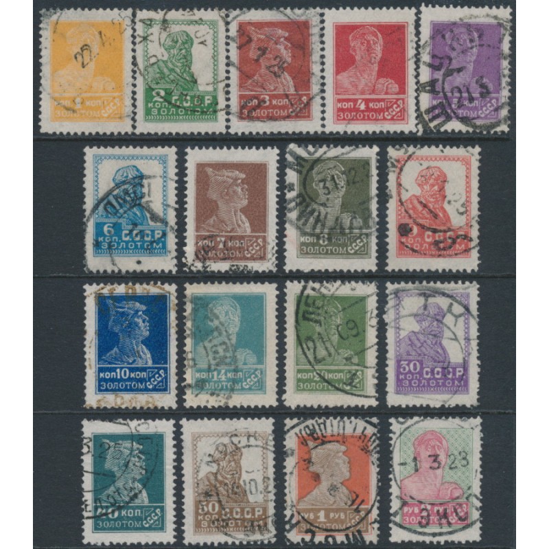 1924 1Kop to 2R Strength of the Revolution set (missing only the expensive 15K yellow value), perf. 14¼:14¾, no watermark, used – no thins, tears or bends.