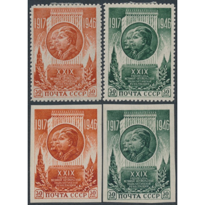 1946 30K red-brown & 30K green October Revolution sets of 2, perf. & imperf., mint hinged – no thins, tears or bends.